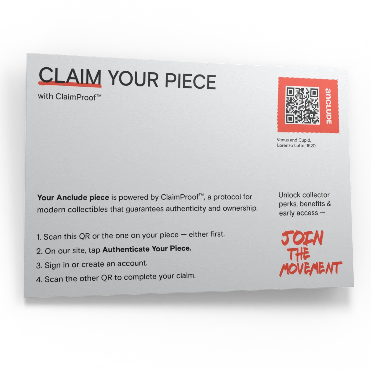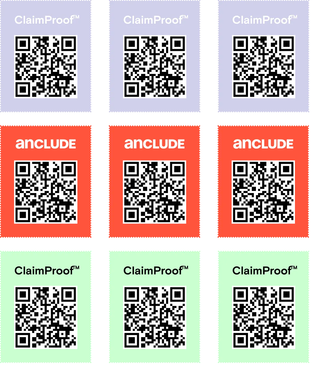 ClaimProof™ is built on single‑use marked QR pairs. One printed directly on the Anclude piece and one on a postcard inside the package. When both are scanned together the ownership is locked. This makes duplication or forgery virtually impossible and ties the digital record directly to the physical collectible.