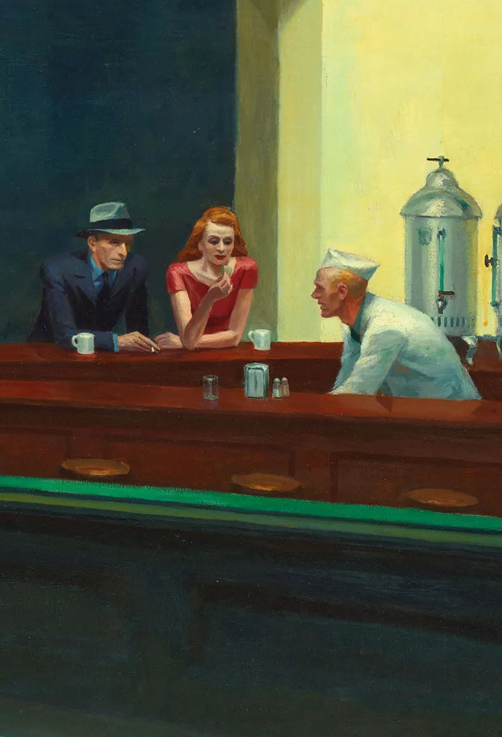 Edward Hopper’s Nighthawks captures a moment that’s both ordinary and unsettling. You’re staring at an all-night diner, where the neon glow spills onto empty streets, and you can almost hear the humming of the fluorescent lights. Inside, a handful of characters, including a couple that doesn’t seem to be in the throes of passionate conversation, sit quietly at the counter. The server is there but isn’t paying them much attention. Everyone seems isolated, even though they’re sitting mere feet apart. It’s like witnessing a slice of insomnia itself.