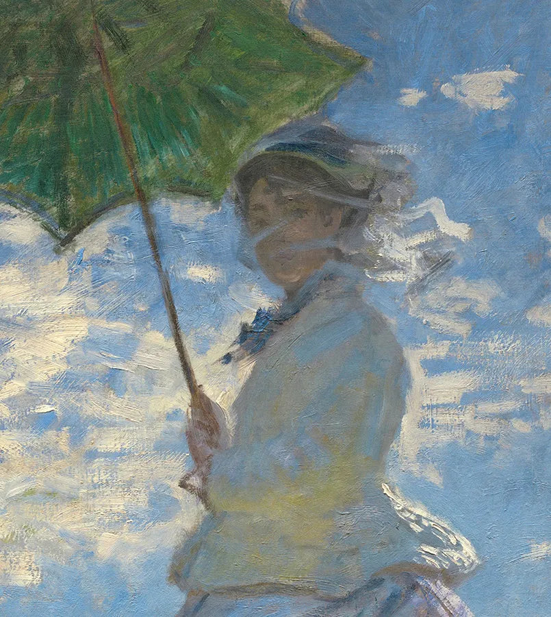 The composition is masterful. Camille is positioned slightly off-center, creating a natural, spontaneous feel. Her tilted parasol adds a dynamic diagonal line that guides the eye across the painting, echoed by the gentle slope of the hill. Jean, placed lower in the frame, balances the composition, creating an intimate, unposed scene. The background’s soft, indistinct forms emphasize Camille and Jean without distracting from them.